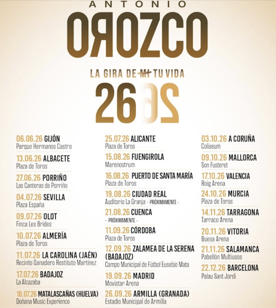 En paralelo, Antonio Orozco encara 2026 con “La gira de tu vida”, su nuevo proyecto en directo, que nace como evolución natural del exitoso ciclo anterior. Tras una etapa marcada por la revisión de sus 25 años de trayectoria y una respuesta masiva del público —con aforos prácticamente completos y más de 250.000 entradas vendidas—, el artista da un paso más para situar a sus seguidores en el centro de la experiencia.